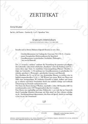 Im Anschluß an den erfolgreich absolvierten Kurs erhalten Sie ein Zertifikat über die erworbenen "Griechischkenntnisse um Umfang des Graecums". Unsere Zertifkate wurden deutschlandweit von Universitäten zum Nachweis von insbesondere "Griechischkenntnissen", in Ausnahmefällen auch anstelle des staatlichen Graecums anerkannt (z.B. Uni Tübingen, FU Berlin, Uni Heidelberg). In den meisten Fällen wird jedoch das staatliche Graecum ausdrücklich gefordert. Die Anerkennung erfolgt jedoch immer spezifisch für einen bestimmen Studiengang bzw. eine bestimmte Fächerkombination. Wir empfehlen daher ausdrücklich, die Anerkennung unseres Zertifikates mit der zuständigen Prüfungsbehörde Ihrer Universität vorab abzusprechen, wobei wir diesbezüglich die Vorlage des nebenstehenden Musterzertifikates empfehlen.