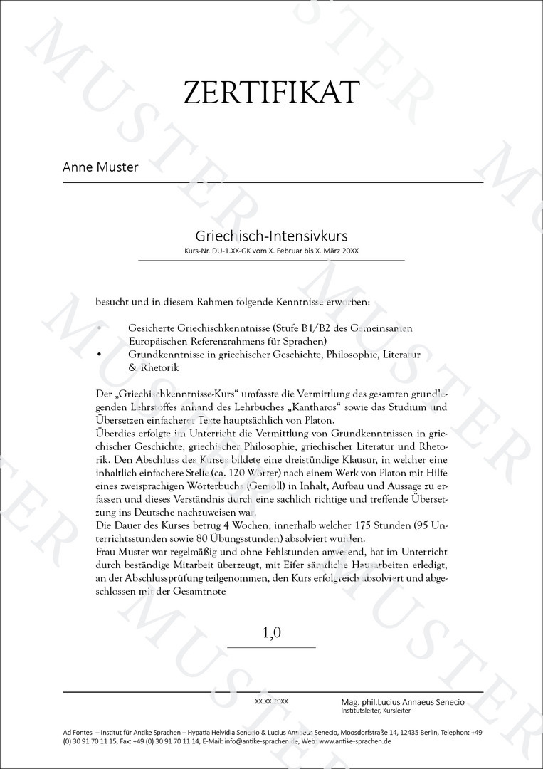 Im Anschluß an den erfolgreich absolvierten Kurs erhalten Sie ein Zertifikat zum Nachweis über die erworbenen "Griechischkenntnisse" (GER: B1/B2). Unsere Zertifkate wurden bereits von vielen Universitäten in Deutschland, Österreich und der Schweiz anerkannt (bspw. Uni Bochum, Uni Osnabrück, LMU München). Die Anerkennung erfolgt jedoch immer spezifisch für einen bestimmten Studiengang. Wir empfehlen daher ausdrücklich, die Anerkennung mit der zuständigen Prüfungsbehörde Ihrer Universität vorab abzusprechen, wobei es ratsam ist diesbezüglich das nebenstehende Musterzertifikat vorzulegen.