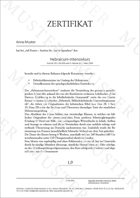 Im Anschluß an den erfolgreich absolvierten Kurs erhalten Sie ein Zertifikat zum Nachweis über die erworbenen "Hebräischkenntnisse im Umfang des Hebraicums" (GER: B2). Unsere