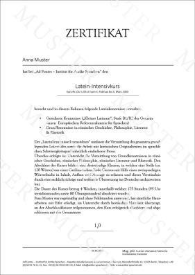 Im Anschluß an den erfolgreich absolvierten Kurs erhalten Sie ein Zertifikat zum Nachweis über die erworbenen "Gesicherte Lateinkenntnisse" im Umfang des Kleinen Latinums (GER: B1/B2). Unsere Zertifkate wurden bereits von vielen Universitäten deutschlandweit und auch in Österreich anerkannt (bspw. Heidelberg, Dresden, Braunschweig, Hannover, Würzburg, HU Berlin, Augsburg, Salzburg, LMU München). Die Anerkennung erfolgt jedoch immer spezifisch für einen entsprechenden Studiengang. Wir empfehlen daher ausdrücklich, die Anerkennung unseres Zertifikats mit der zuständigen Prüfungsbehörde Ihrer Universität vorab abzusprechen, wobei es ratsam ist, hierbei das nebenstehende Musterzertifikat vorzulegen.